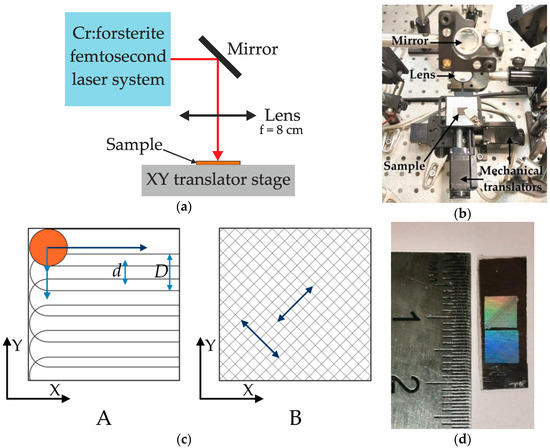 The films were processed by femtosecond laser pulses in a scanning mode, which was realized by moving the samples in the horizontal plane (XY) perpendicular to the laser beam. A system of two automated mechanical translators Standa was controlled by a personal computer and used to move the samples. The laser polarization vector was directed along the X axis. The setup scheme and its photo are given in Figure 1a,b, respectively.