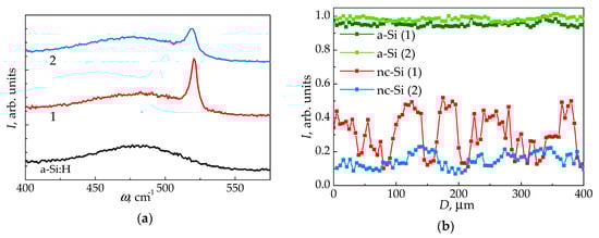 where IA and IC are the integrated intensities of TO phonon modes corresponding to the frequencies ωA and ωC, σ0 is the empirical ratio of the Raman scattering integrated cross sections for the crystalline and amorphous silicon phases, which is determined by the formed silicon nanocrystals size [30]. The size of nanocrystals estimated from the shift of the Raman line at 520 cm−1 [30] is ≈3.6 nm for sample 2 and ≈5 nm for sample 1. Corresponding σ0 values varied from 0.9 to 0.6, while for bulk c-Si this value equals 0.1 [30]. Obtained according to (7) values of the nc-Si phase volume fraction for sample 1 and 2 are 28 ± 16% and 17 ± 4%, respectively. As can be seen in Figure 3b, the nc-Si phase distribution is significantly less homogeneous within the sample 1, compared to sample 2. This can be explained by the difference in scan lines formation on the irradiated surface when using different scanning modes. As a result, fluence is more nonuniformly distributed within the treated area cross section at applying the one-pass scanning mode A than in case of multi-pass mode B (Figure 1c).