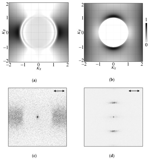 Results of the efficacy factor η(κx, κy) modeling for the samples (a) 1 and (b) 2, and their comparison with the Fourier-transformed SEM images of the LIPSS experimentally observed on the surface of corresponding samples (c,d). The arrows indicate the orientation of the laser radiation polarization vector.