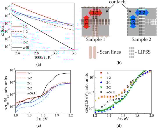 The dark conductivity temperature dependencies of the unmodified a-Si:H and samples 1, 2 are given in Figure 5a. Each curve corresponds to different applied electric field vectors E relative to scan lines and formed LIPSS, according to Figure 5b. It is worth to mention that the scheme for sample 2 in Figure 5b do not show the scan lines, since they are directed at ±45° angles to the applied E accordingly the scanning mode B (Figure 1c), and therefore do not affect the conductivity.