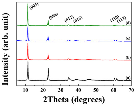 It is generally known that Ga3+ tends to develop thermodynamically stable gallium oxide hydroxide (GaOOH) under hydroxide-rich condition [40]. In order to exclude the formation of unexpected Ga and Al-impurity during incorporation reaction, the PXRD patterns of samples at representative time points were recorded (Figure 2). The diffractogram showed that parent MgAl-LDH had typical hydrotalcite-like structure (JCPDS No. 14-0191) with sharp diffractions corresponding to (003) and (006) attributed to ordered 2-dimensional layer stacking [41]. In addition, the (110) and (113) diffraction from crystallographic ab-plane of LDH lattice were clearly observed at 60.4° and 61.7°, respectively.