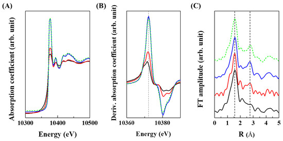Ga k-edge (A) X-ray absorption near-edge structure, (B) derived X-ray absorption near-edge spectra, and (C) Fourier-transform extended X-ray absorption fine structure (FT-EXAFS) spectra of Ga@LDH-0.5 (black line), Ga@LDH-1 (red line), Ga@LDH-24 (blue line), and MgGa-LDH (green dots).