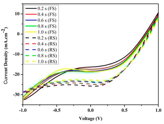 As can be seen from Figure 2 and Table 1, as the delay increased from 0.2 to 1 s, the hysteresis was suppressed and the corresponding hysteresis index reduced from 0.36 to 0.18, respectively, as a result of relaxation of the measured currents at each applied voltage, and the difference between parameters extracted from the measurements made for forward and reverse scan directions decreased. When performing measurements on solar cells at faster scan rates or sweep time delays longer than 1.0 s, almost the exact same J–V curve may be obtained regardless of the scan direction. However, achieving this steady state is not that easy for PSCs where hysteretic-like features arise, as noticed in this work and earlier studies [,,].