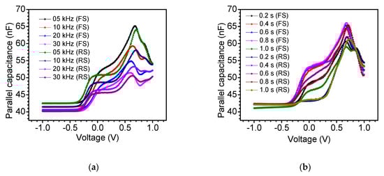 As can be seen from Figure 3, the hysteresis was observed to be strongly sweep bias voltage, sweep scan direction, sweep time delay, and frequency dependent. It can be seen from Figure 3a that with the increase in frequency, the capacitance decreased both for the forward and reverse scan directions, and the hysteresis was suppressed. When the time delay increased, the capacitance increased and the hysteresis was suppressed. In the time-dependent J–V and CP–V curves, the hysteresis exhibited the same trend and revealed suppression.