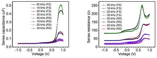 3.2.2. Hysteresis Series Capacitance–Voltage (CS–V) and Series Resistance–Voltage (RS–V) Characteristics
