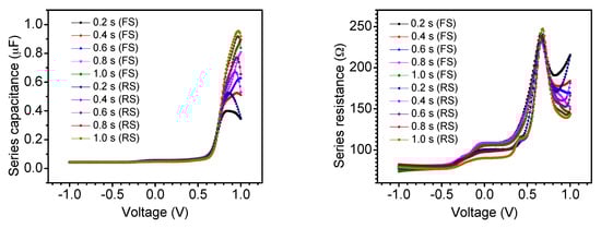 The frequency-dependent series capacitance–voltage (CS–V) and series resistance–voltage (RS–V) curves recorded on the device are shown Figure 4. The time-delay-dependent series capacitance–voltage (CS–V) and series resistance–voltage (RS–V) characteristics are displayed in Figure 5. The hysteresis was observed to be strongly sweep bias voltage, sweep scan direction, sweep time delay, and frequency dependent. A strong voltage dependency was observed for capacitance and resistance at higher values of voltage bias. When the applied bias was low, both the resistance and capacitance remained unchanged, as can be seen in Figure 4 and Figure 5. However, at higher applied bias, the spectra exhibited strong voltage dependency. As it has been previously described [], at zero applied bias, the device is fully depleted, but as the forward bias reaches around 0.5 V, the depletion width shrinks causing an increase in the cell capacitance. Similar time-delay-dependent C–V behavior has been reported in PSCs fabricated using expensive hole transport materials [].