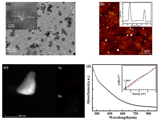 Figure 2 illustrates typical characterization of the as-prepared SnSe NSs. The morphology of the SnSe NSs was characterized by TEM and AFM. Figure 2a shows the TEM image of SnSe NSs, which indicates NSs with non-uniform sizes. The inset high resolution TEM image in Figure 2a demonstrates the distribution of lattice spacing stripes of SnSe NSs and the lattice spacing was about 0.301 nm. There is approximately 92° of intersection angle at the lattice fringes, which corresponds to the (011) planes of the orthorhombic structure of SnSe crystal [13]. Figure 2b shows the AFM images of the SnSe NSs on the substrate, which reveals that the SnSe NSs have the non-uniform size and different thickness. The typical thickness was found to be ~12 nm and 8 nm (Figure 2b inset) by a random line, respectively. The thickness of monolayer SnSe is ~1 nm, but it is difficult to get monolayer NSs due to the strong inter-layer interactions by the lone-pair electrons of Se [27], the probed SnSe NSs have a layer number around 10 but this thickness cannot cover all SnSe NSs in the solution [12]. Therefore, the as-prepared SnSe NSs have widely dispersed electronic band gaps. In addition, Figure 2c gives a closer image of a single SnSe NSs image and we can see that the uniform distribution of Sn and Se elements of SnSe NSs. The UV-vis absorbance spectroscopy was measured to investigate the optical properties of SnSe NSs (Figure 2d). It is clear that SnSe NSs shows a high absorption from 300 nm to 800 nm. The indirect bandgap of SnSe NSs is calculated based on Tauc’s equation (αhν)1/2 = A(hν − Eg). By substituting the data of UV-vis-NIR spectra, the tauc plot can be obtained in the inset of Figure 2d. The band gap value is 1.34 eV, which is in agreement with the reported results [15,28]. In an indirect band gap semiconductor, indirect electron transitions require electrons interact not only with the photons, but also with lattice vibrations in order to either gain or lose phonons. Thus, indirect band gap semiconductors show broad absorption in the measuring range. This phenomenon can be observed in other layered IV–VI chalcogenides NSs [16,29].