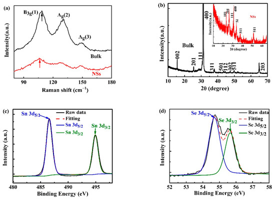 Raman spectroscopy was employed to characterize bulk SnSe and SnSe NSs (Figure 3a). According to the theoretical crystal symmetry, a total of 12 active Raman modes exist in SnSe bulk [30]. However, only three vibrational modes and located at 108 cm−1, 128 cm−1, and 149 cm−1 can be readily detected. The intensity of the Raman peaks is significantly reduced in the SnSe NSs. In addition, there was a slight red shift of the mode between SnSe NSs and SnSe bulk, which can be attributed to the fact that mode is an out-of-plane mode, and thus it is more sensitive to the layer numbers [31]. Reduction of the peak intensity and shift of the peak position are common in 2D materials such as graphene and phosphorene, which might be attributed to the decrease of the atomic thickness and structural defects [16]. The XRD pattern of bulk SnSe is shown in Figure 3b. All the peaks were consistent with peaks obtained in other studies and a strong peak (400) was observed at 2θ = 31.2° [13,14]. Furthermore, all the main diffractions of SnSe NSs (Figure 3b inset) were in accordance with the bulk above and there were no observations of SnOx = 1,2 peaks. The intensity of several peaks of SnSe NSs decreased or disappeared [e.g., (400), (201), or (002)], which might result from the defects on the exposed surface after the exfoliation process [32]. In order to determine the element composition of SnSe NSs, it was further characterized via the high-resolution XPS spectra analysis, as shown in Figure 3c,d. The ratio of Sn: Se elements was close to 1:1 and the two peaks, located at 494.9 eV and 486.6 eV, were in agreement with the Sn 3d3/2 and Sn 3d5/2 binding energies of SnSe, and the peaks located at 55.7 eV and 54.7 eV corresponded to the doublets of Se 3d3/2 and Se 3d5/2 [33].