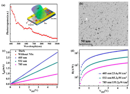 The results of optical absorption (Figure 2d) and carrier dynamics (Figure 4) indicate the broadband absorption and fast carrier recovery time of SnSe NSs, which can be applied in a high-speed and broadband photodetector. A phototransistor with SnSe NSs–monolayer graphene was constructed, three different lasers (405, 532, 785 nm) were employed to evaluate its optoelectronic properties and all the photoelectric measurements were conducted in the glove box. An n-doped silicon substrate was cleaned using ultrasonic machine in order to fabricate the device, and then processed using O2 plasma. The electrodes were formed by shadow masking onto the substrate. On the other hand, the monolayer graphene-field devices were prepared using the wet-transfer method, followed by drop-casting of SnSe NSs on the graphene channel. Figure 5a shows the optical response of the phototransistor from 400 to 1000 nm measured under VDS = 5 V. The spectral response of the device basically follows the absorption spectrum of the SnSe NSs. The schematic of a typical SnSe NSs–monolayer graphene hybrid photodetector is shown in Figure 5a inset. Figure 5b shows SEM image of the SnSe NSs on the top of graphene channel. The image reveals a discrete distribution of SnSe NSs on graphene, which leads to the formation of junctions between the SnSe NSs and graphene. In this study, the photocurrent (Iph) was calculated according to the expression of Iph = Ilight − Idark. Figure 5c shows the typical photocurrent curves as a function of the source–drain bias (VDS) with different excitation wavelengths. There was no photocurrent change of the monolayer graphene device under the light. It is clear that the photocurrent increases linearly with the rise of VDS when the SnSe NSs was decorated on the graphene film. The highest photocurrent, a large value of ~3.00 mA, was obtained under 405 nm light illumination (VDS = 5 V). In addition, a photocurrent of ~2.04 mA was observed under light illumination of 532 nm. Increasing the wavelength leds to the hybrid device displaying a photocurrent of ~0.95 mA under 785 nm illumination. The current change of photodetector can be attributed to the carrier accumulation in graphene, which are formed from charge transfer after optical excitation. The photoresponsivity (Rph) is calculated as Rph = Iph/P, where P is defined as incident optical power. Indeed, it is found that the maximum responsivity is about 1.75 × 104 A/W while illuminated at 405 nm with a radiation density of 23.6 μW/cm2, as shown in Figure 5d. It is worth noting that the channel length (200 μM) was larger than the length reported in previous SnSe-based photodetector studies [12,13,19,40]. Figure 5d also demonstrates that the responsivity decreases with the increase of light wavelength. The maximum responsivity under the 785 nm is found to be 1.52 × 103 A/W at the power density of 155.2 μW/cm2.