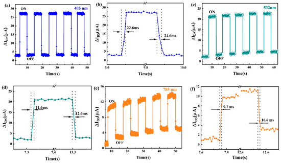 Channel photocurrent response to on/off light illumination (a) 405 nm (c) 532 nm (e) 785 nm for several cycles and time-resolved channel photocurrents to show the rise and fall times for (b) 405 nm (d) 532 nm (f) 785 nm. (Light power density of 155.2 μW/cm2, VG = 0 V, and VDS = 0.05 V).