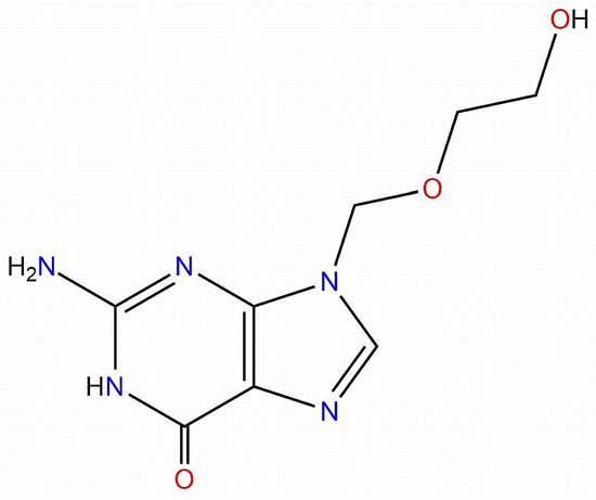 Acyclovir (Figure 1) is a guanosine synthetic analogue widely used in the treatment of herpetic infections, particularly Herpes simplex and Varicella-zoster viruses; its action is based on its bioactivation to acyclovir monophosphate and further to acyclovir triphosphate which acts as a competitive inhibitor of DNA polymerase due to its similarity to the structure of deoxyguanosine triphosphate [1].