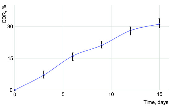 An almost linear increase of the cumulative percentage of the acyclovir released inside the simulated body fluid was obtained by maintaining 2 mL aqueous solution of PU_NP_acycl sample (1.0 mg/mL) in 30 mL SBF (Figure 2). SBF maximum absorption was measured at 470 nm every third day using pure SBF as reference.