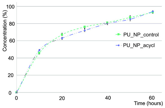Fast penetration processes were observed for both tested samples (PU_NP_control and PU_NP_acycl (Figure 4). It can be observed that almost 50% of particles penetrated the artificial membrane in the first ten hours and almost 75% passed through the membrane in the first 24 h.