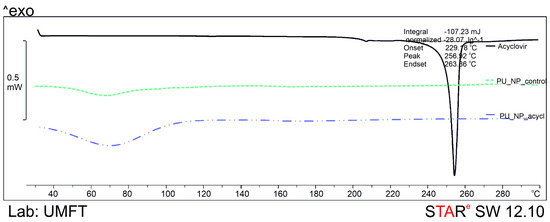 The thermal stability of PU was previously described by C Bolcu and F Borcan [15] who reported that PU materials can be heated up to 300 °C without the degradation of the macromolecular chains. No significant peaks can be noticed in the thermograms of PU_NP_control and PU_NP_acycl samples both containing PU nanoparticles (Figure 5); the absence of the drug’s characteristic peak around 255–260 °C on the PU_NP_acycl sample curve indicates the complete encapsulation of acyclovir inside the PU carrier nanoparticles. The glass transition of PU materials cannot be seen on the thermograms due to the fact that, according to P. Somdee et al., the process occurs between −57 °C and −52 °C [43].