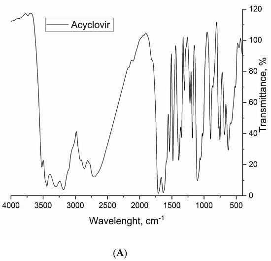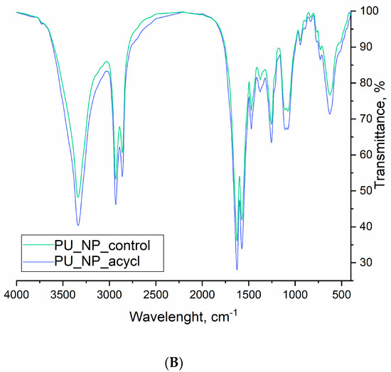 The FT-IR spectra of pure acyclovir as well as the overlapped spectra of PU_NP_control and PU_NP_acycl samples are presented in Figure 8A,B, respectively.
