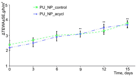 O Kose et al. [51] have reported that modifications of the skin parameters (in particular the level of TEWA and erythema) after the application of an irritative agent are fast and directly proportional with the irritation potential of the respective chemical agent. In the current 15-days experiment, the evolution of TEWA was characterized by an increase of 0.7 g/h/m2 in the first week. A similar value was determined in the second week of the experiment for both samples. Usually, an increase of the TEWA values is associated with a decrease of the skin barrier function. However, very low values of TEWA variations were recorded thus indicating the tested samples as reliable chemical agents [52]. The assessment of erythema values showed a daily increase of about two units in the first week and approx. three units/day during the second week of the experiment for both samples. A definite irritative process was already evaluated and established as reference in one previous study conducted in our Phyto-science Research Center. Briefly, the repeated application of pure chili pepper extract on human skin has increased the erythema level by approximately 100 units over two weeks [14]. Therefore, we may conclude that the erythema values recorded for the PU tested samples indicate their low irritative potential therefore their suitability for topical application. PU materials are described as safe, biocompatible, and non-irritant in literature [53]. On the other hand, D. Ciorba et al. [54] has reported important TEWA modifications (around 30 g/h/m2) in a study based on a test with 100 μg/L chloroform solutions and the amplitude of these changes can be considered as an irritation reference.