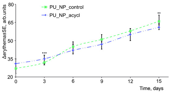 Six healthy human volunteers (2 men and 4 women, between 31 and 42 years old) were subjected to the topical application of samples with or without acyclovir, respectively, in order to further evaluate the skin irritation induced by the use of each product. The two synthesized samples (PU_NP_control and PU_NP_acycl) have been applied as aqueous solutions (1:20 w/v) on different areas of the left anterior forearm every third day (0.5 mL/application); the assessment of skin irritation has been conducted 20 min later on each area. The tests were carried out with a MultiProbe Adapter System from Courage & Khazaka Electronics (Koln, Germany), equipped with a Tewameter® TM300 probe and a Mexameter® MX18 probe. Average values calculated as differences between the values recorded before and after application were collected, taking into account the variations in skin type between the investigated volunteers.