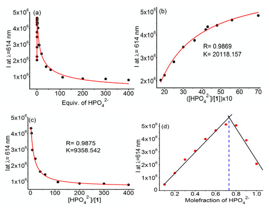 Upon further addition of HPO42− to the reaction mixture, a gradual decrease in the luminescence, at 614 nm, of receptor 1 was observed (Figure 2a). The changes in the luminescence intensities, as displayed in Figure 2a, can be attributed to the two distinct behaviours of 1 against HPO42−. Therefore, the spectrometric titration (Figure S11) has offered two association constants. Figure 2a also displayed that the luminescence intensity of the emission maximum decreased to a constant level after the addition of 4 mM of phosphate. Therefore, it is evident from Figure 2a that 1 can be used to sense a wide range of phosphate concentrations. The analytical limit of detection (LOD) [59,60,61,62] of 1 for phosphate was calculated as 0.1 μM. Since the sensing of hydrogen phosphate showed nonlinear fitting in Figure 2b,c with one enhanced and the other quenching the luminescence intensity, we applied the nonlinear fit data point results by following Equations (1) and (2), [63,64,65,66] respectively, providing the binding constants K1 = 2.0 × 104 M−1 (R = 0.9869), 1st part, attributable to luminescence enhancement and K2 = 0.94 × 104 M−1 (R = 0.9875), 2nd part, associated to luminescence quenching.