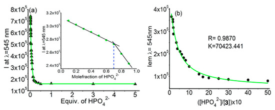Screening complex 3 towards various anions (10 equiv.), shown in Figure 1c, illustrates again an excellent luminescent probe for HPO42− with superior selectivity and sensitivity. Upon the addition of HPO42−, the emission intensity of 3 was reduced to 8%. Systematic spectrophotometric titration with an increasing concentration of hydrogen phosphate ions in the range 0.01–5 equiv. was performed (Figure 4a and Figure S16). Unlike, 1 and 2, the luminescence intensity of 3 demonstrated a steady quenching process. The luminescence intensity was quenched continuously from the very beginning of HPO42− addition and at the 100 μM HPO42− concentration; the emission quenched completely and remained constant thereafter (Figure 4a). The LOD for complex 3 was derived as 0.2 μM. The binding constant was determined from nonlinear data fitting using the Equation (2), and the respective association constant (K) was found to be 7.0 × 104 M−1 (R = 0.9870) (Figure 4b). A molecular ion peak at m/z = 803.56 (Figure S17) can be attributed to the generation of [TbL(HPO4)2 + Na+ + H+] (calcd. m/z = 803.45) in solution. Thus, all three complexes are established to bind phosphates in 1:2 stoichiometries.