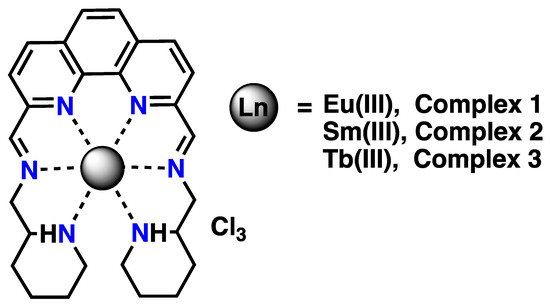 2,9-Bis(aminomethylpiperidine)-1,10-phenanthrolene (L) and its Ln(III) complexes 1, 2, and 3.