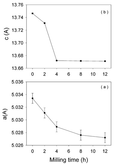 The lattice parameters c and a of hematite, as function of the ball milling time; (a) stand for a lattice parameter and (b) for c lattice parameter.