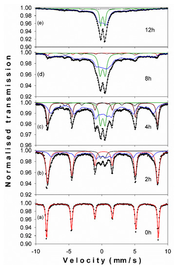 57Fe Mössbauer spectra recorded at room temperature for different ball milling times: (a) 0 h, (b) 2 h, (c) 4 h, (d) 8 h and (e) 12 h.