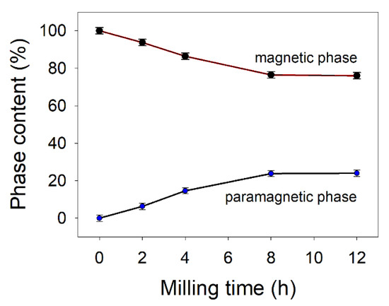 In the last few decades, the mechanical milling technique has been recognized as a method to obtain nanoscaled materials in which extended solid solutions or non-equilibrium phases can be formed at friendly temperatures [17,18,19,20,21]. Recent papers [22,23,24] report the synthesis of some ferrite systems directly by a high-energy ball milling technique (HEBM); e.g., starting with ZnO–Fe2O3 [22], La2O3–Fe2O3 [23], Eu2O3–Fe2O3 [24] oxide mixtures, the HEBM process leads directly to the formation of ZnFe2O4, LaFeO3, and EuFeO3, respectively.