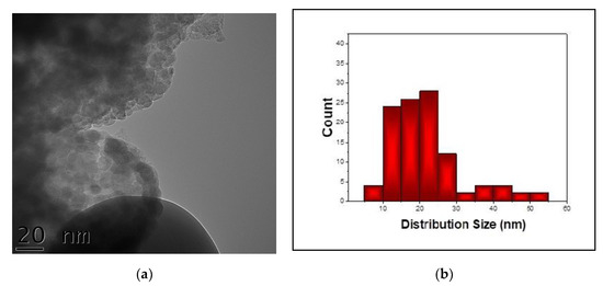 (a) TEM image on the gallium-doped hematite sample after 12 h of ball milling, and (b) the histogram for particle size distribution in the sample.