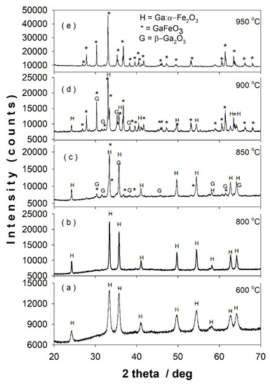 Table 3 presents the lattice parameters, reliability R factors, crystallite sizes, and the phase content of the calcined samples as resulted from Rietveld structural refinements. At 600 °C and 800 °C (Figure 7a,b) only the nanoscaled gallium-doped hematite pattern can be observed. The crystallite size increases from ~21 nm at 600 °C to ~62 nm at 800 °C. The thermal treatment at 850 °C (Figure 7c) reveals the initiation of GaFeO3 formation (~13 wt. %) with the persistence of gallium-doped hematite (~75 wt. %). One can remark the unexpected appearance of β-Ga2O3 phase (~12 wt. %) in the XRD pattern of the sample calcined at 850 °C. The XRD pattern of the sample calcined at 900 °C (Figure 7d) consists in a prevailing GFO phase (~69 wt. %) together with gallium-doped hematite and small amounts of β-Ga2O3. At 950 °C (Figure 7e), the XRD pattern indicates only the presence of the single GaFeO3 phase. The calcination at 1000 °C leads also to the single phase of gallium orthoferrite with crystallite size greater than 100 nm.