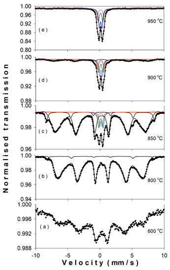 The Mössbauer spectra of the samples calcined at (a) 600 °C, (b) 800 °C, (c) 850 °C, (d) 900 °C, and (e) 950 °C.