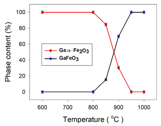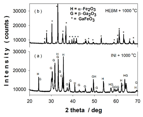 The phase evolution in the system versus treatment temperature (up to 1000 °C) is shown in Figure 9. Figure 10a,b emphasizes the key role of the energetic mechanical activation in significantly reducing the temperature required to obtain the gallium orthoferrite, compared with the common solid phase synthesis procedure.