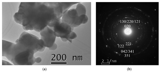 Figure 11a,b displays the morphology and the selected area electron diffraction (SAED) pattern for the sample after 12 h of energetic milling followed by calcination for 4 h at 950 °C, proving the formation of the unique phase GaFeO3. The selected area electron diffraction (SAED) pattern shows a uniform distribution of diffraction spots in circles indicating the random crystallographic orientation of the GFO particles, further suggesting the polycrystalline nature of the material. The calcination process increased the particle size from ~20 nm to ~150 nm.