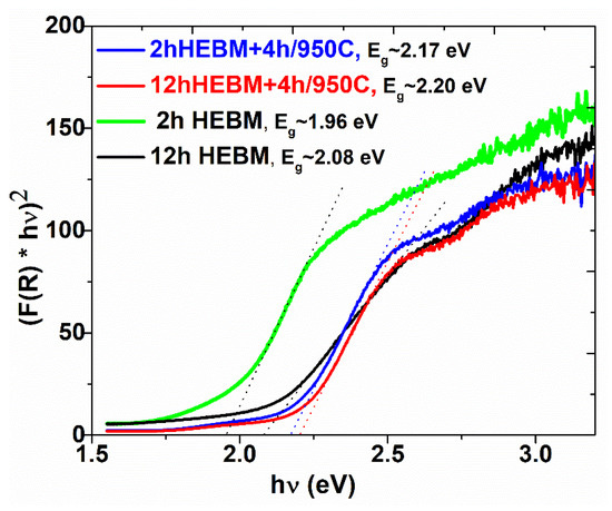 In the case of Ga:α-Fe2O3, one can observe an increase of the reflectance (R) with milling time, for wavelengths higher than 500 nm, so the absorbance decreases in this range. A higher value of R was obtained for the sample subjected to HEBM for 12 h. The same behavior was evidenced in the case of GaFeO3; the lines in Figure 13b refer to the samples milled for 2 h and 12 h, respectively.
