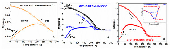 The GFO obtained after 2 h of milling and 4 h of calcination at 950 °C shows a maximum (i.e., a cusp in the temperature dependence of magnetization) before reaching the magnetic order transition. The magnetic order-disorder transition temperatures were determined as the differential minimum from the first derivative of the temperature dependent magnetization on the field cooling (FC) (see inset of Figure 15c). For the GFO sample obtained after 2 h of milling and 4 h of calcination at 950 °C the Curie ferromagnetic–paramagnetic transition (Tc) takes place at 201 K, while for the GFO obtained after 12 h of milling and 4 h of calcination at 950 °C, we obtained 205 K as transition temperature. The obtained values for the magnetic order-disorder transitions are comparable with the values obtained on GFO prepared by solid state reaction in [1,12].