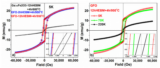 The hysteresis curves measured for GaFeO3 obtained after 12 h of HEBM and calcination for 4 h/950 °C at 5 K, 70 K, and 220K are shown in Figure 16b. The coercitive field is much higher at 5 K (2533 Oe), compared to 70 K (1618 Oe) and 220 K (719 Oe). As mentioned in [12], since coercivity is related to magnetic anisotropy, the irreversible magnetic behavior reflects the role of anisotropy in determining the shapes of FC and ZFC curves below the ordering temperature.