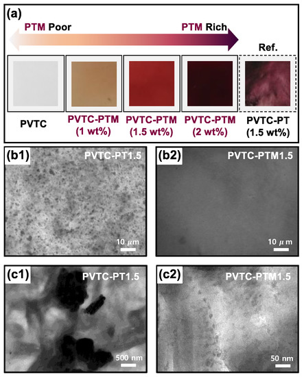 (a) Photographs of pristine PVTC, PVTC-PTM1, PVTC-PTM1.5, PVTC-PTM2, and PVTC-PT films. OM images of (b1) PVTC-PT1.5 and (b2) PVTC-PTM1.5. TEM images of (c1) PVTC-PT1.5 and (c2) PVTC-PTM1.5.
