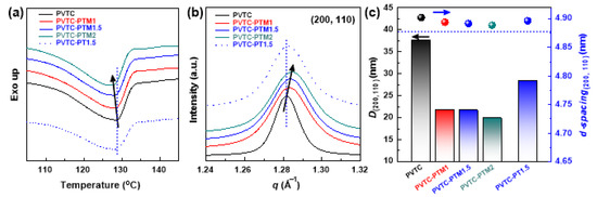 The compatibility of PTM with the PVTC matrix was examined by DSC. The DSC curves were acquired by a second run process with a heating rate of 10 °C min−1. The obtained endothermic peak in PVTC was observed at 127.8 °C, which corresponded to the melting point (Tm) of the PVTC. The blending of the PVTC with the PTM led to decreased Tm from 127.5 to 128.9 °C with an increase of the PTM loading content from 1 to 2 wt% (Figure 3a). Our previous reports importantly discussed the behavior of the Tm decrease in PVDF-based polymers by the compatible blend, which originated from the reduction of the crystal size in the lamellar crystalline structure of PVTC [21,35,37]. In contrast, PVTC-PT1.5 exhibited almost similar Tm (128.7 °C) to that of PVTC. It indicates the lesser effectiveness of PT for the crystalline structure alteration of PVTC than that of PTM.
