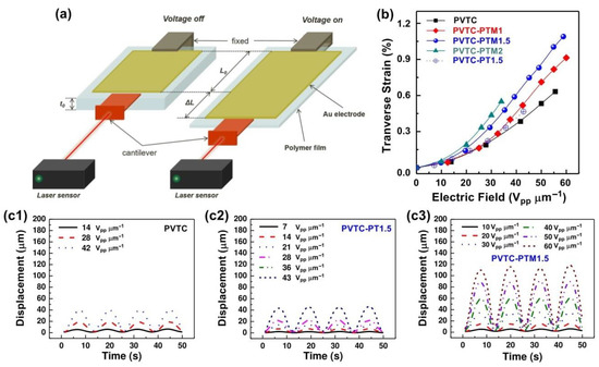 On the basis of the studies for the PVTC-PTM crystalline properties, we expected that the PVTC-PTM blends would have the better electromechanical performance in comparison to the PVTC and PVTC-PT because of the smaller crystal grain size and the higher polar crystalline properties (Figure 3c and Table 1) [15,38]. To confirm our hypothesis, the electromechanical performances of the PVTC and its blends were evaluated under the different electric fields. The electromechanical operation system was set up as depicted in Figure 4a, where the sample was loaded between the holder and the cantilever. The displacement was measured using a laser sensor under the control of the voltage on and off (0.2 Hz AC electric signals). Having acquired displacement changes, the transverse strain (S) was calculated by the following equation: S (%) = (∆L/L0) × 100 (%), where ∆L is the displacement of the films by the electric field and L0 is the transverse length of the original film.
