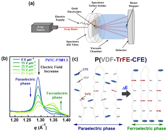 The electromechanical properties of the PVCT-PTM blends were evaluated on the basis of the parameter differences regarding other reference materials. In addition, we significantly discussed the electromechanical strain mechanism of PVCT-PTM blends with abundant evidence to reveal what parameters specifically affected their electromechanical operation mechanism. The mechanism was seen to be dominantly affected by the electrostrictive forces from the enhanced dielectric properties of PVTC by adding the PTM conducting filler. Those can be acceptable in the common understanding from reported PVDF-based electromechanical studies [49,50,51]. Moreover, the electron delocalization in the electrostrictive polymers can help the fast electron displacement within the polar groups in the polymer chains [7]. It corresponded to the quick response to the polar group alignment in PVTC polymer chains [7]. The WAXS studies with the PVTC-PTM blend can also give a significant clue to understanding the electromechanical strain in the bulk film. The crystalline phase transition from paraelectric to ferroelectric can give rise to the alteration of the micro-crystalline domain volume by their unique alignment of polymer chains, which well-linked to the displacement of the bulk state film [14,38]. To confirm our suggestion in the relationship between the crystalline phase change and electro-mechanical strain, we set up the WAXS measurement system under the electric field. The Teflon insulator enclosed the PVTC-PTM1.5 sample; it was located at the center of the C-ray beamline along with the electric supply connection to the electrodes on both sides of the film (Figure 6a). WAXS patterns of the PVTC-PTM1.5 were acquired under a particular electric field with a minute retention time. The resulting WAXS patterns are displayed in Figure 6b. The WAXS pattern of the PVTC-PTM1.5 without the electric field showed the paraelectric dominant crystalline phase. The ferroelectric phase in the PVTC-PTM1.5 was smoothly grown up by an increase of the electric field, and it then showed a decrease of the paraelectric phase. The crystalline phase transition from paraelectric to ferroelectric was observed at the electric field of 55 V μm−1 (Figure 6b). Figure 6c introduces what changes in the crystalline domain of the PVTC by the para-to-ferroelectric phase transition. The polar group in the crystalline domain of the PVTC film experienced good alignment along the same direction under the electric field. The alignment of the polar groups in polymer chains eventually affords the rearrangement of the bulk film volume. It affects the transverse strain by increasing the length of the PVTC-PTM1.5 bulk film. We believe that the WAXS study provides essential information to address the electromechanical strain mechanism of the PVTC-PTM blend.