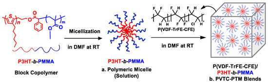 Schematic depiction for P(VDF-TrFE-CFE)/P3HT-b-PMMA (PVTC-PTM) blends with a compliant self-assembly process.