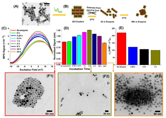 Since the polymer used to fabricate the 2D-Clusters is sensitive to esterase [26,39], here, the change in MPI/MRI signals was investigated over time, upon exposure to porcine liver esterase at 37 °C, using MPI and MRI relaxometry (Figure 2B, scheme). Remarkably, following the addition of the enzyme, the MPI signal gradually increased with the incubation time and reached maximum values, both in terms of PSF and SNR signals, after an incubation time of 3 h (Figure 2C,D). The relatively high MPI signal at 3 h can be attributed to the structural disassembling of the initial 2D-Clusters (Figure 2F1) into shorter chain-like fragments as confirmed by TEM images (Figure 2F2). This enhancement is consistent with the MPI signal observed for the Di/Tri (Figure 1) sample, although the nanocubes used as building blocks for the two types of arrangements were prepared by different synthetic methods and therefore provide MPI signals significant different with each other. As reported by others [23,25,40], it is likely that the uniaxial dipolar coupling of the magnetic easy axis of nanoparticles inside the chains, improves the magnetization along the length of the chain enabling the sample to respond well to the AC magnetic field excitation during MPI measurement. However, the MPI signals after 24 h and 48 h of incubation period, dropped beyond the maximum values at 3 h, whereby TEM confirmed the presence of precipitate formation (Figure 2F3) and large aggregates (Supplementary Figure S6), which likely led to reduced Brownian relaxation and diminished the MPI response as it happened for the 3D-Clusters. It is also worth to mention that if the same Fe3O4 IONCs batch used for the 2D-Clusters were dispersed in water as single nanoparticles, they possess MPI signal that is better than that of the commercial Std or the same nanocubes arranged in a 2D or a 3D configuration (Supplementary Figure S7). These results may be likely related to the magnetization saturation values of the IONCs and the 2D-Clusters. The single nanocubes and the 2D-Clusters exhibit typical superparamagnetic behavior at 298 K (Figure. S8) with saturation magnetization (Ms) value of 105 emu/gFe for individually coated IONCs and a slightly lower value of 95 emu/gFe for the 2D-Clusters. These Ms values are also comparable (slightly higher) to the Ms values at room temperature previously measured for the Si, Di/Tri, and 3D-Clusters and after phase transformation from core-shell to the Fe3O4 single phase [23].