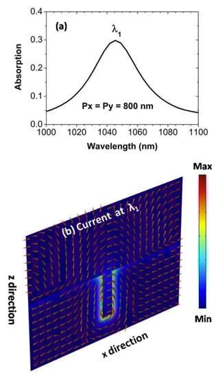 (a) Numerically calculated absorption spectra at normal incidence, with geometrical parameters of px = py = 800 nm, L = 500 nm, d = 200 nm, and w = 50 nm. (b) Current distributions at the wavelength of λ1 on the xz plane along the white dotted line in Figure 3a. The colors represent the current strength, and the red arrows give the current directions.