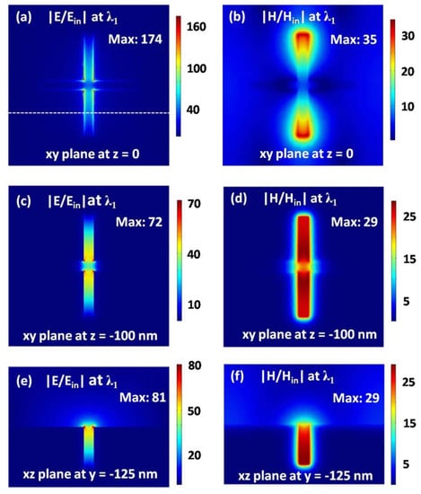 Electric (a,c,e) and magnetic (b,d,f) field strength at the resonance wavelength of λ1. The xy plane with z = 0 (a,b) is just on the top surface of the metal substrate. The xy plane with z = −100 nm (c,d) is at the geometrical center of the cross-shaped hole. The xz plane with y = −125 nm (e,f) is along the white dotted line in (a).