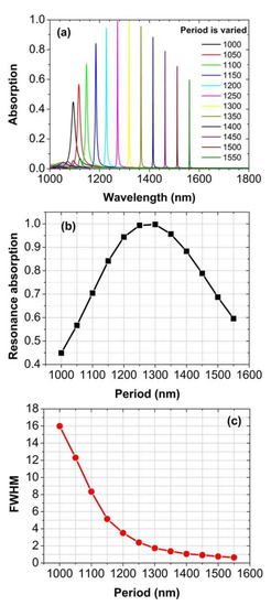 (a) Normal-incidence absorption spectra for the period (px = py) to be varied from 1000 to 1550 nm in steps of 50 nm. (b,c) Maximum value and FWHM of absorption peak for different periods, respectively.