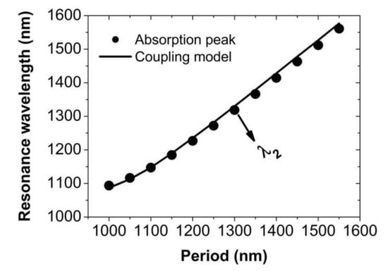 The energy of magnetic resonance, EMR, is 1.1866 eV, corresponding to the wavelength of λ1 = 1045 nm. The energy of surface plasmon polaritons, ESPP, can be analytically obtained for different periods [79]. In Figure 5, we have compared the positions of absorption peaks for different periods with the resonance wavelengths of the hybrid mode predicted by the above theoretical model with the coupling strength Δ = 0.008 eV. Obviously, they are in an excellent agreement.