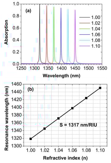 To study the potential sensing applications of our studied nanostructures, in Figure 7a we show a series of absorption spectra at normal incidence with the array periods px = py = 1300 nm, for the refractive index of surrounding medium is varied from 1.0 to 1.1 in steps of 0.02. When the refractive index of surrounding medium is increased slightly, the absorption peak will shift obviously, which is very sensitive to the change of the refractive index. Figure 7b shows the dependence of the position of the absorption peak on the refractive index. Conventionally, two important parameters, sensitivity (S) and figure of merit (FOM), are widely used to estimate the sensing performance [80,81,82,83,84]. S and FOM can be defined as: