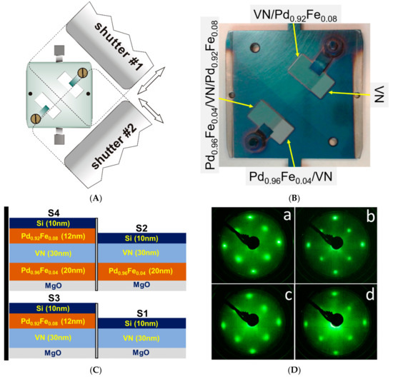 Deposition of the four-sample series in one run: (A) layout of the sample holder and shutters; (B) photo of the sample holder with the synthesized structures; (C) sketch of the sample’s structures; and (D) LEED patterns (a, pristine MgO substrate; b, MgO/Pd0.96Fe0.04 structure; c, MgO/Pd0.96Fe0.04/VN structure; d, MgO/Pd0.96Fe0.04/VN/Pd0.92Fe0.08 structure).