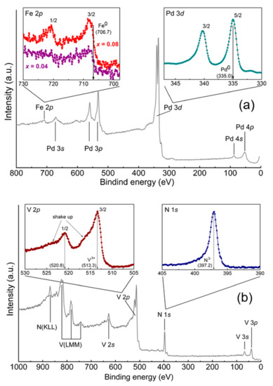 XPS (X-ray photoelectron spectroscopy) spectra of the top layer: (a) after depositions of the Pd1−xFex alloy layer, where the overview spectrum is shown for the Pd0.92Fe0.08 layer; and (b) after deposition of the VN-layer, where callouts show high-resolution spectra in the particular ranges of binding energies of the constituent elements.