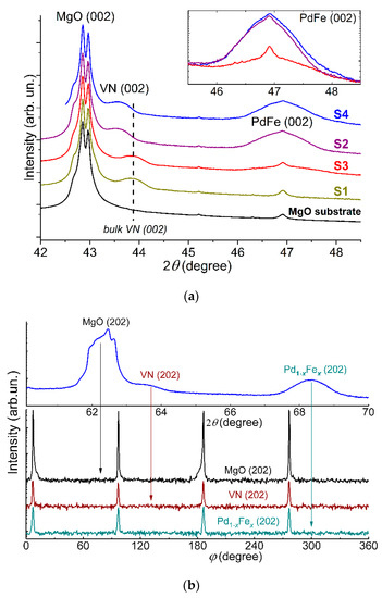 The figure shows a significant relative shift of the (002) XRD-maxima from the VN layer of Samples S1 and S3 with respect to Samples S2 and S4, clearly correlating with the material that served as a substrate for the VN layer. For Samples S1 and S3, MgO (a = 421.2 pm) was the substrate for the VN (a = 412.6 pm). Therefore, the lattice of the VN film is stretched a bit in its plane; accordingly, the interplanar distance along the normal is reduced, and the angle of the (002) maximum is increased. For Samples S2 and S4, the Pd0.96Fe0.04 (a = 388 pm) served as the substrate for the VN. The VN lattice is then compressed in its plane; accordingly, the interplanar distance along the normal is increased, and the angle of the (002) maximum is reduced.