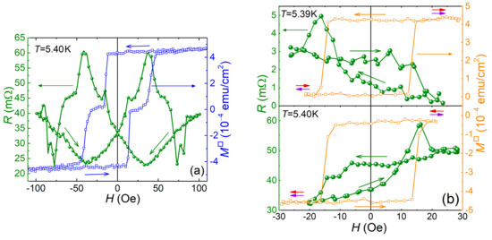R(H) “fast” scans were intended to clarify the origin of pits at the magnetic field values of about ±80 Oe. In this series of quick measurements, the procedure of thermalization, described above, was deliberately shortened to obtain mostly qualitative information. Due to the fast scan, some low-amplitude features of RS4(H) were smeared or lost compared with those in Figure 6. The measurements of the single VN film (Sample S1), the middle scan in Figure A1a, clearly demonstrate that ±80 Oe pits originate from the VN layer.
